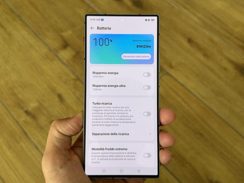 Interessante la funzione di separazione della carica: possiamo scegliere di non ricaricare la batteria quando il telefono è collegato all'alimentatore, in modo da non surriscaldarlo.