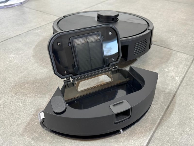Rispetto a modelli più costosi, qui manca la classica stazione di ricarica: il robot non si svuota automaticamente, ma saremo noi a svuotare la vaschetta di raccolta della polvere quando sarà necessario. Stessa per il panno, che andrà lavato a mano quando sarà sporco.