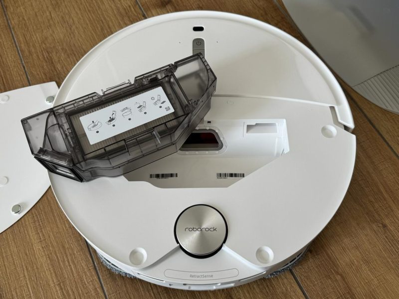 Nella parte superiore troviamo 2 pulsanti, il sensore che rileva le altezze (ed evita di fare incastrare il robot sotto ai mobili) e la copertura in plastica che permette di accedere alla vaschetta della polvere da 245ml. Il robot la svuota automaticamente quando torna alla base.