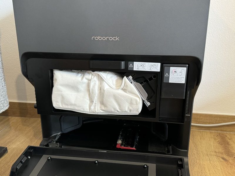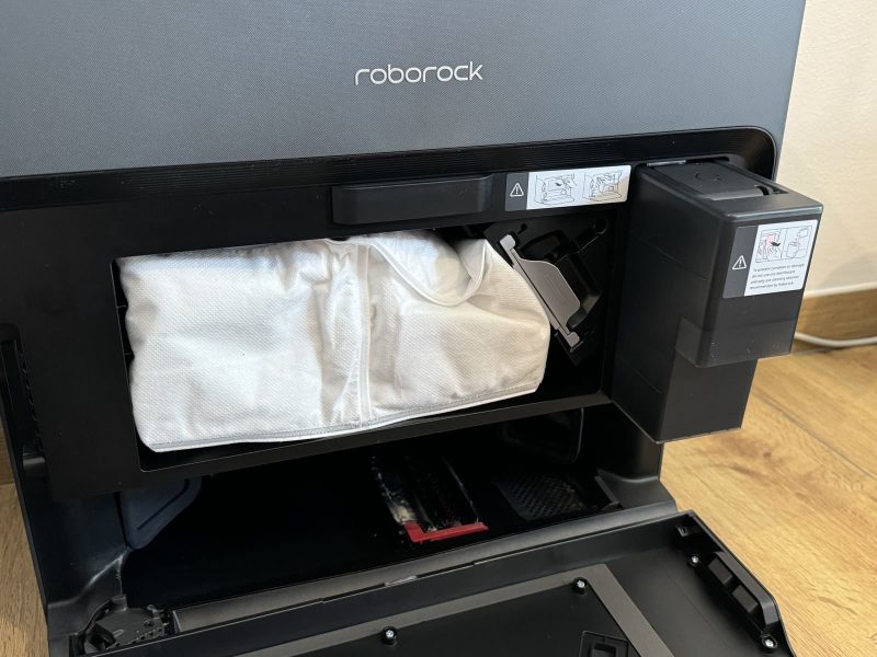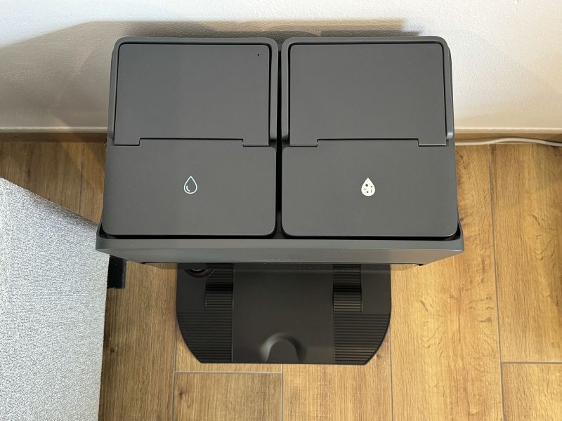 Frontalmente abbiamo invece il sacchetto di raccolta della polvere (da 2.5L, dura fino a 7 settimane) e lo slot per inserire il detergente (580ml): sarà il robot ad aggiungerlo automaticamente all'acqua pulita quando lo riterrà necessario.