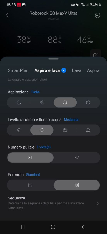 Tramite l'app possiamo scegliere tra 2 livelli di precisione della navigazione (veloce o standard): questo influenza il percorso seguito dal robot e ovviamente il tempo richiesto per la pulizia.