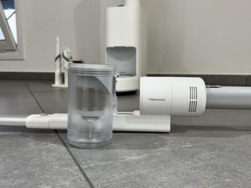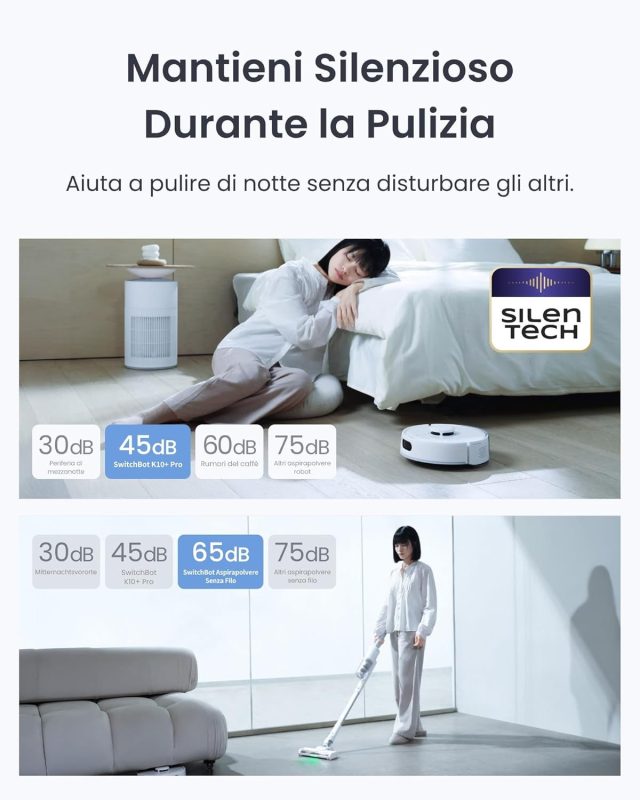 Switchbot K10+ Pro Combo è il robot più silenzioso in assoluto, visto che si ferma a soli 59dB. Se lo usiamo a potenza minima, in casa non si sente visto che emette un rumore di soli 48 dB.