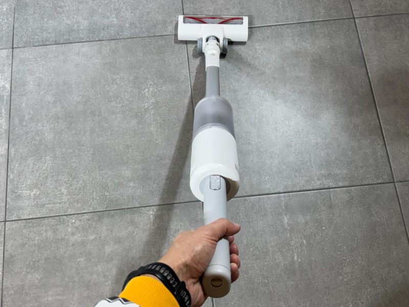 Per aspirare e controllare il dispositivo dobbiamo impugnarlo usando il tubo che contiene la batteria, che ha però una posizione parallela al nostro braccio e non perpendicolare, contrariamente ai concorrenti.
