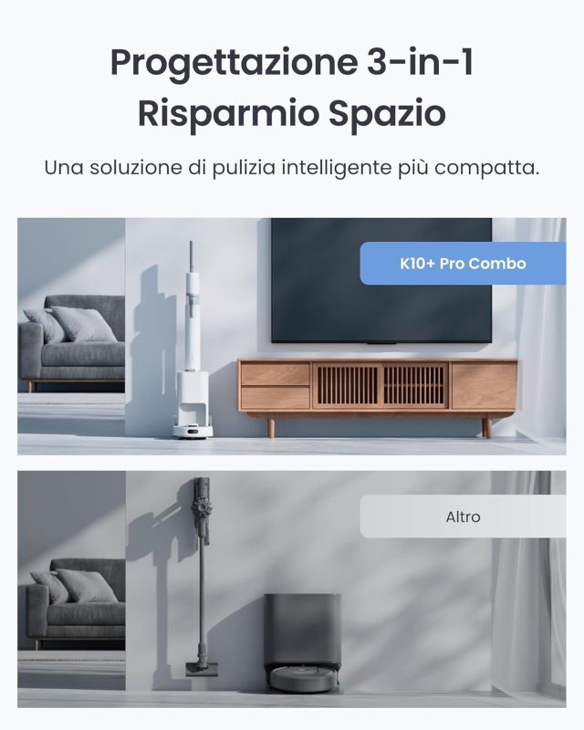 La combo di robot e scopa elettrica ci permette di pulire tutta la casa senza lasciare indietro nessuna zona, ma soprattutto senza avere troppi dispositivi costosi e ingombranti sparsi per casa.