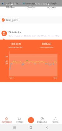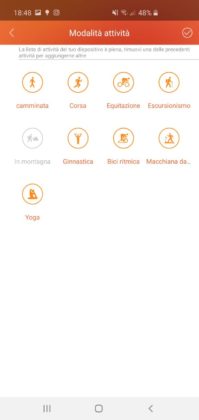 - Le attività che si possono registrare sono: corsa all’aperto, camminata, bicicletta, trekking in montagna, tapis roulant, bici ritmica (presumo sia l'ellittica tradotta male), yoga, ginnastica. Nessuna di queste viene rilevata automaticamente ed è sempre necessario avviare la sessione manualmente
