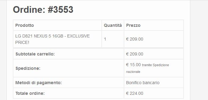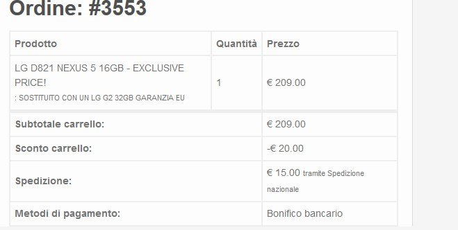 Acquistiamo un Nexus 5 il 30 Dicembre 2014 a 209 euro più 15 di spese di spedizione. Paghiamo a mezzo di bonifico bancario ed inviamo la mail con il CRO. Dopo qualche minuto qualcuno, ci risponde che procederanno con l'evasione dell'ordine appena possibile. Inizia il carteggio di mail con l'operatore che ci conferma che aspetteremo al massimo 15 giorni lavorativi.