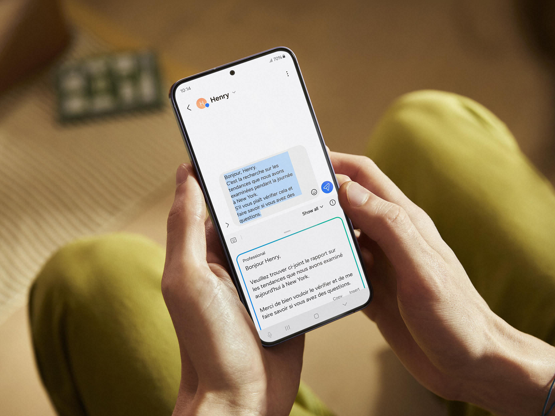 - Assistente Chat: aiuta a perfezionare il tono della conversazione nei messaggi e in altre app. Garantisce che "la comunicazione avvenga con lo stile e il registro linguistico desiderati". Si tenga presente che anche la tastiera Samsung è dotata ora di intelligenza artificiale, e può tradurre in tempo reale messaggi e mail in 13 lingue diverse.