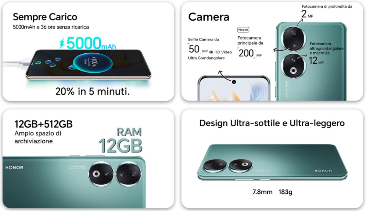 HONOR 90 è disponibile all’acquisto in Italia nelle colorazioni Midnight Black, Emerald Green e Diamond Silver nelle configurazioni 8-256 GB e 12-512 GB al prezzo consigliato di rispettivamente 549,90 euro e 599,90 euro.