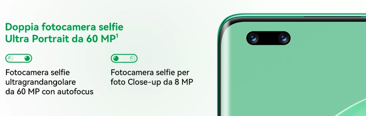 Frontalmente troviamo una doppio sensore frontale con un modulo principale Ultra Portrait da 60 MP (con ultra-wide da 100°) accompagnato da un'unità da 8 MP per ritratti ravvicinati con zoom ottico 2X e digitale fino a 5X (con possiibilità di 0,7X per i selfie di gruppo).