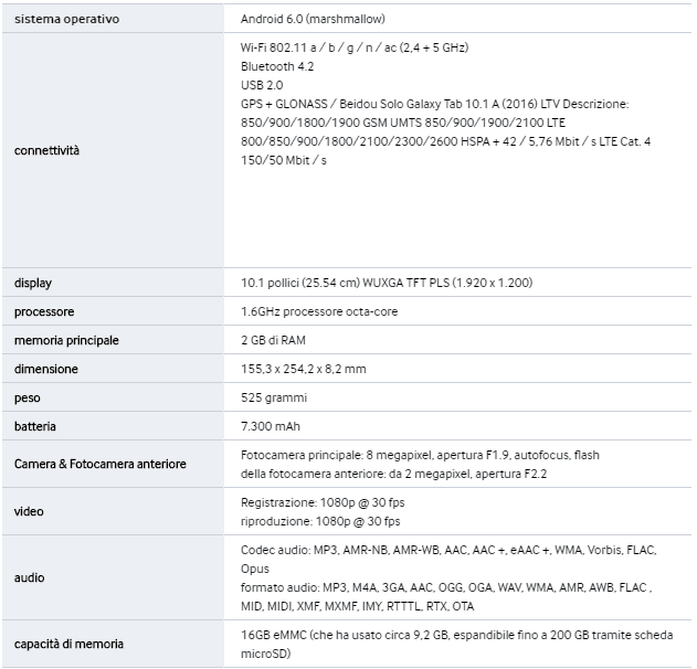 Vediamo le caratteristiche tecniche di Samsung Galaxy Tab A 10.1 (2016):