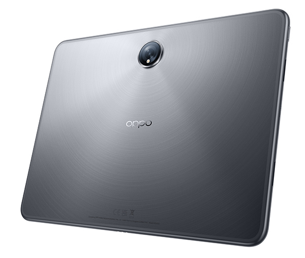 OPPO Pad 2 può vantare uno spessore di soli 6,54 mm e un peso di 552 g per la sua scocca in metallo unibody di colore grigio, con texture metallica al posteriore che circonda la fotocamera.
