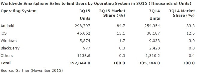 Ecco che come ogni mese, Gartner, produce le statistiche di distribuzione dei vari sistemi operativi mobile con Android che è ancora leader indiscusso del mercato con oltre l'84% di quota di mercato seguita a distanza siderale da iOS con il 12,5% e con un misero 1.7% coperto da Windows. Dunque anche se non c'era bisogno di questi dati, Android, continua a dominare in lungo e largo con un aumento di 1.4 punti percentuali, tutti sottratti a Windows che perde un bel 1.3% rispetto allo scorso anno con Microsoft che ha la sola opportunità di Windows 10 per un pronto rilancio.