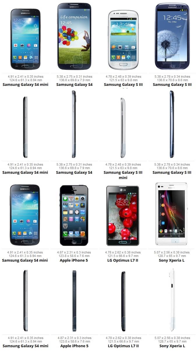 In questo articolo vediamo un bel confronto di dimensioni con i principali concorrenti sul mercato tra vecchi e nuovi dispositivi. Infatti vedremo un bel confronto tramite delle immagini sulle dimensioni del nuovo Galaxy S4 Mini con il Samsung S4, S3, S3 Mini, iPhone 5, Sony Xperia L e LG Optimus L7 II.