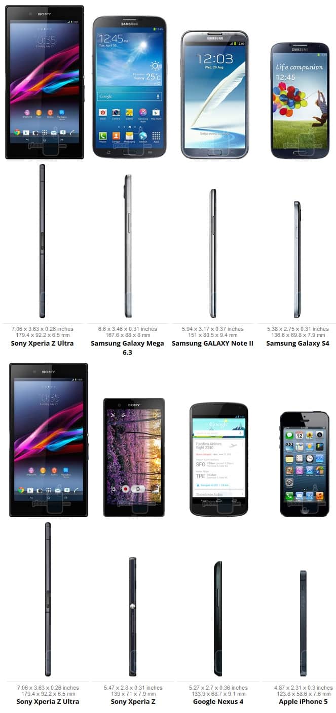 Confronto Dimensioni Sony Xperia Z Ultra vs Xperia Z, Galaxy Mega, Note 2, S4, Nexus 4 e iPhone 5