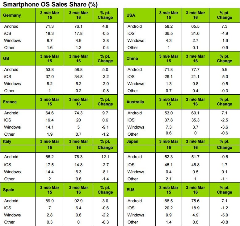 Dati Kantar Aprile 2016: Android domina ed Windows Phone in picchiata