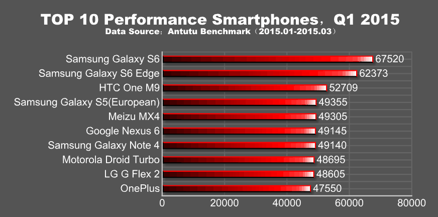 Fuori dal podio troviamo altri smartphone con punteggi che si aggirano tra i 49.000 fino ai 47.500 con il dominio di Qualcomm grazie ai chip Snapdragon 801 ed 805 fa volare la vecchia generazione con i vari Galaxy S5 ed i nuovi Meizu MX4. Fuori dai fantastici cinque troviamo il Nexus 6, il Note 4 che ottiene un punteggio mediocre ed infine il Motorola Droid Turbo, LG G Flex 2 e fanalino di coda il OnePlus.