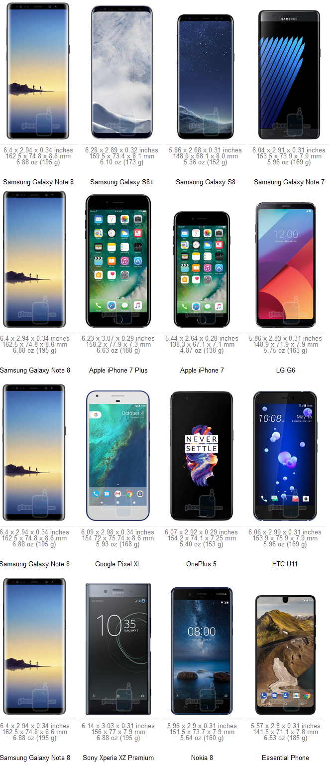 Confronto dimensioni Note 8 vs Galaxy S8, S8+, LG G6, iPhone 7, Pixel XL, HTC U11, OnePlus 5