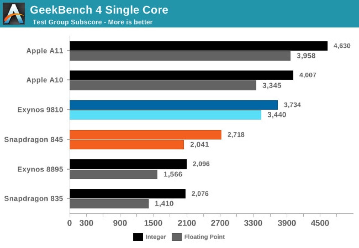 Come vedete dai risultati pubblicati di seguito, l'Exynos 9810 di Samsung montato sull'S9 è meno prestante di circa il 20/25% rispetto al processore Apple A11 e quasi il 50% più veloce rispetto al potente Qualcomm Snapdragon 845 appena uscito sul mercato.