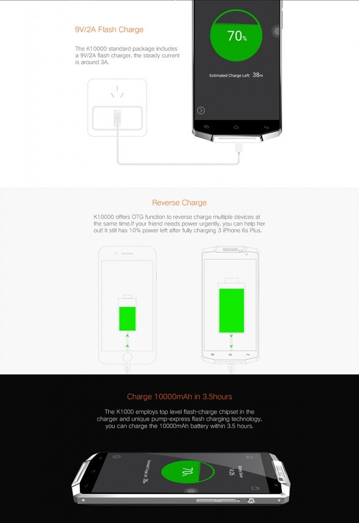 Questo OUKITEL K10000 invece promette bene poichè tra le slide di presentazione si parla molto di un'efficace gestione delle risorse e dello standby. Infatti sembra che gli sviluppatori abbiano posto particolare attenzione a tutta la gestione dei processi e della rete in standby. Ma non solo poichè a completare la dotazione una batteria da ben 10000 mah e ricarica veloce 9V/2Ah in cui si raggiunge il 100% della batteria in sole 3,5 ore.