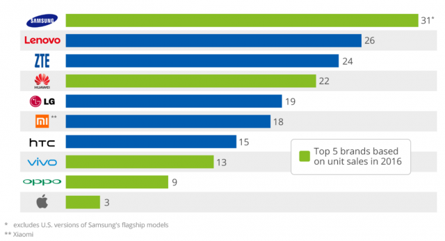 Nel 2016 Samsung ha commercializzato ben 31 modelli diversi, seguita da Lenovo e ZTE. Apple a quota 3.