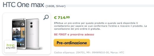 Infatti Expansys ha messo in pre-ordinazione l'HTC One Max con memoria da 16 GB ad un prezzo di 714,99 € il che fa pensare che il prezzo ufficiale dell'HTC One Max sarà d 699 € con memoria da 16 GB e 749 € per quello da 32 GB. Sicuramente stiamo parlando di cifre importanti ma che si vanno ad allineare con quelli della concorrenza, in special modo con i prezzi del Note 3, almeno per quanto riguarda quelli ufficiali.