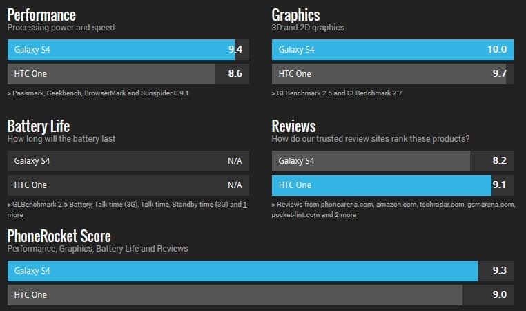 Ebbene si il vincitore degli innumerevoli test condotti dai colleghi di PhoneRocket sanciscono, anche se di pochissimo la vittoria del Galaxy S4 sull'HTC One.