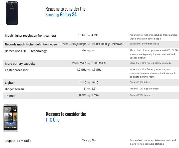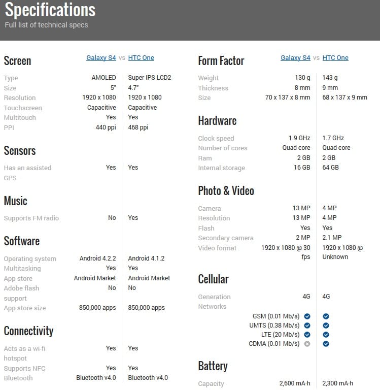 Poi le altre differenze sempre in favore dell'S4 sono la capacità di registrare video in FullHD a 30 fps, di disporre di un Display Amoled dai colori spettacolari, la maggior capacità della batteria, anche se la durata dovrebbe essere a favore, anche se di pochissimo, dell'HTC One, poi il processore ha 200 Mhz in più che vanno volare l'S4, inoltre l'S4 è più leggero di 13 g, ha un display più grande di 0,3" ed è anche più sottile, ma non possiede la radio FM che invece è inclusa nell'HTC One.