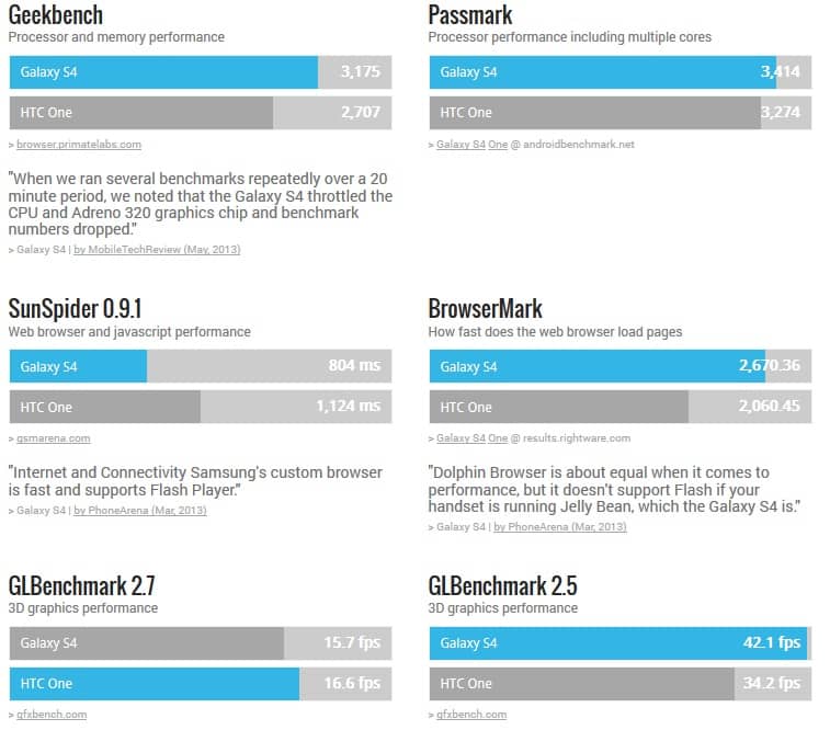 Infine ecco i risultati in dettaglio dei vari tool di benchmark che hanno dato la vittoria al Galaxy S4 anche se c'è da notare che il Clock del processore dell'HTC One anche se il processore è il medesimo presente sull'S4 ha 200 Mhz in meno quindi 1,9 Ghz per S4 contro i1,7 Ghz dell'HTC One.