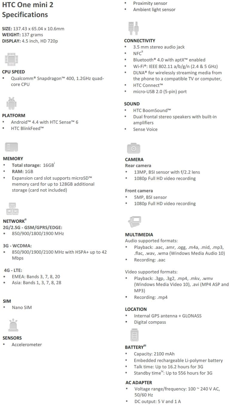 Ecco la scheda tecnica completa dall'HTC One Mini 2: