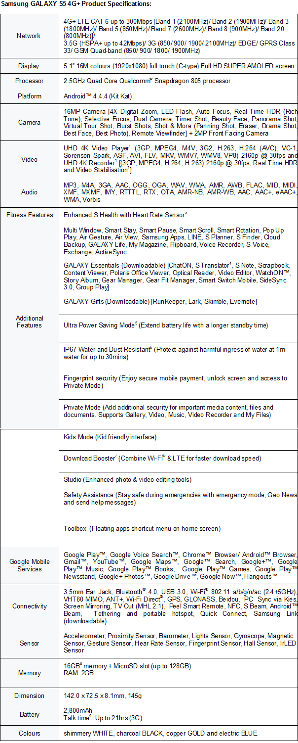 Ufficiale il Samsung Galaxy S5 4G+: CPU Snapdragon 805, Adreno 440 e Display Full HD