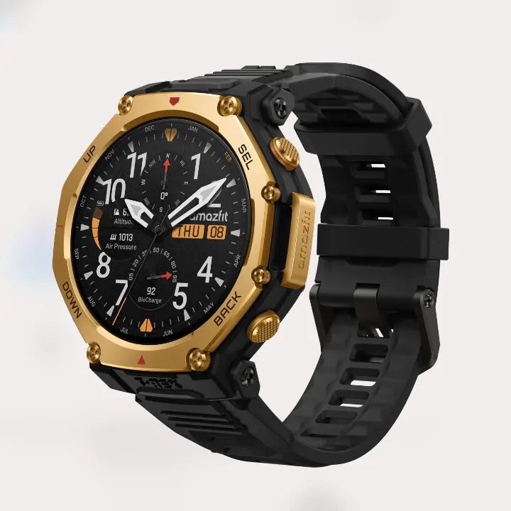 Disponibile in 2 dimensioni — 48 mm e 44 mm — il T-Rex 3 Pro offre varianti colore Tactical Black, Black Gold e Gold and Gray, con cinturini a sgancio rapido da 22 mm.