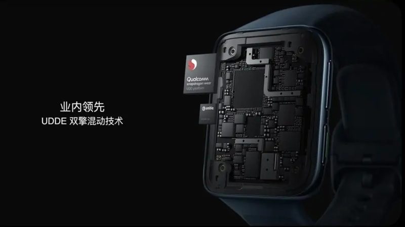Come anticipato, OPPO Watch 2 mantiene il design rettangolare del modello originale, andando però a sostituire lo Snapdragon Wear 3100 con il più recente Snapdragon Wear 4100, affiancato dal co-processore Apollo 4s sviluppato da Ambiq.