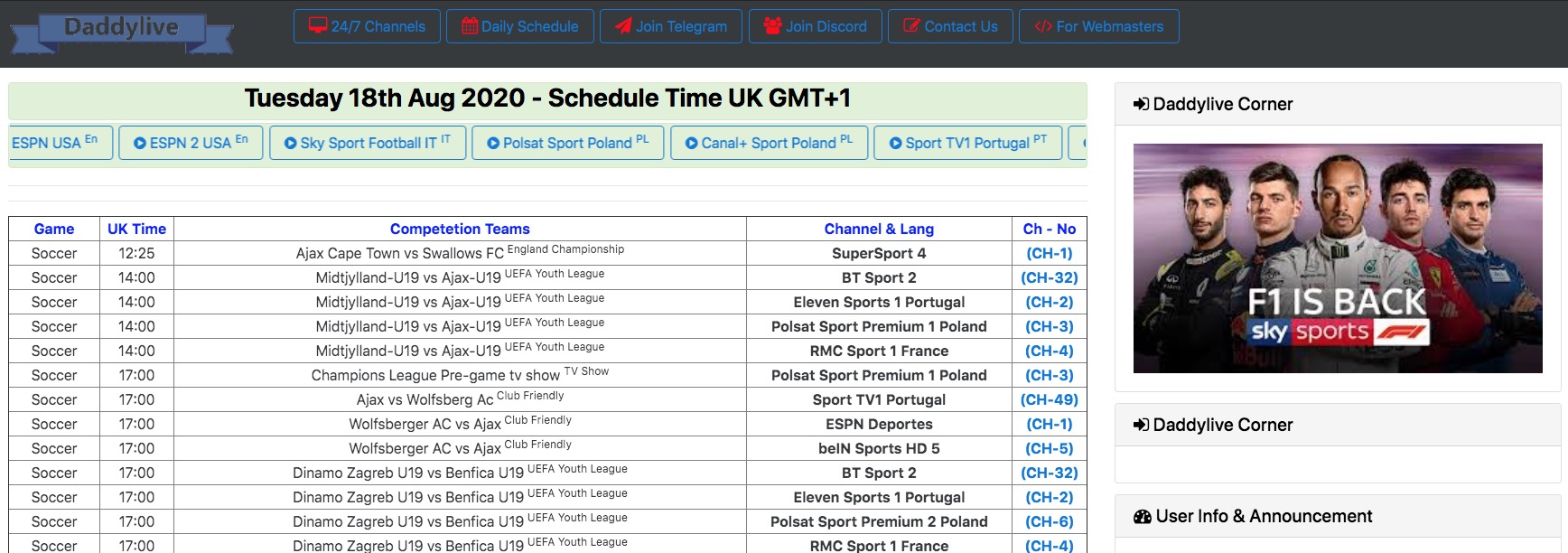 - daddylive.club/index.php – sito inglese, SUPER aggiornato e con tanti canali anche italiani. Funziona solo con VPN
