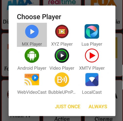 Al contrario di TVTAP, per guardare i canali sarà necessario installare un player video esterno. L'app te ne propone parecchi, sarai tu a scegliere quello che preferisci (consiglio MX Player, si scarica gratis dal Play Store).