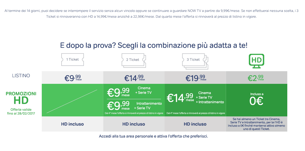 Nel caso abbiate almeno un ticket tra cinema, serie TV o intrattenimento e l’HD è incluso a 0€ almeno finché manterrete attivo il ticket in questione. Ci sono anche delle offerte per chi sottoscrive ora uno o più ticket.