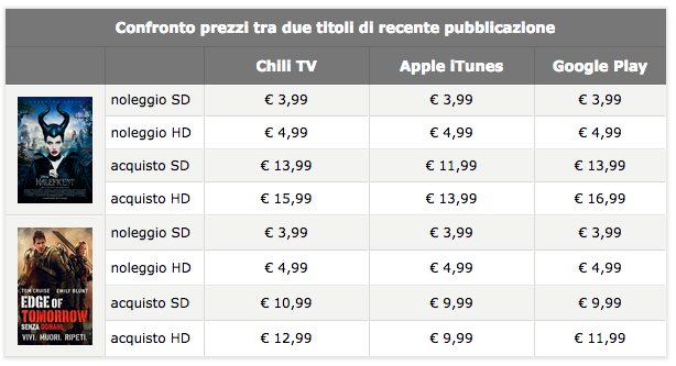 Come potrete notare, i prezzi dei film a noleggio partono da 0,99 euro; 3,99 per una prima visione in SD, 4,99 per l'HD e 5,99 euro per HD+. Mentre quelli in acquisto i prezzi partono da 4,99 euro e arrivano a 16,99 euro, ma ovviamente le cifre cambiano anche a seconda della qualità. In generale, comunque, i prezzi di Chili TV sono in linea con iTunes e Google Play Movies.