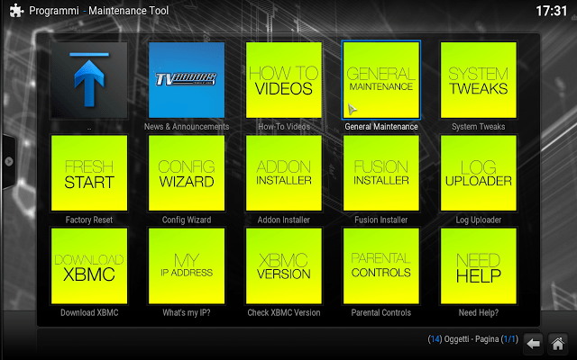 - Cliccando su General Maintenance è possibile ripulire la cache, cancellare ogni tipo di errore dei logs, fare il downgrade di alcuni programmi e add-on, disinstallare programmi, add-on e tanto altro ancora.
