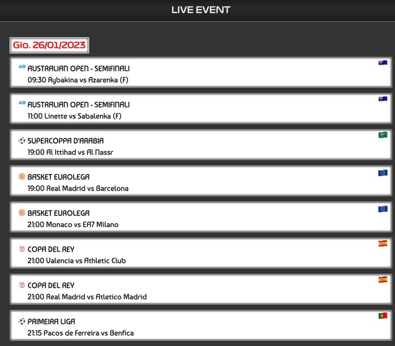 Secondo me ad oggi è uno dei migliori siti per guardare tutto lo sport in streaming gratis (calcio, partite, F1, MotoGP e tanto altro ancora). So bene che esistono centinaia di siti per guardare lo sport in streaming gratis, ma questo è super aggiornato, con tanti canali italiani e funziona davvero bene.