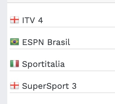 - a questo punto devi semplicemente scegliere il canale da riprodurre in streaming. Come puoi notare, di fianco ad ogni canale c'è una bandiera che rappresenta la lingua della telecronaca e del canale che andrai ad aprire. Ovviamente dove c'è la bandiera italiana significa che il canale è italiano, con telecronaca e commento nella nostra lingua