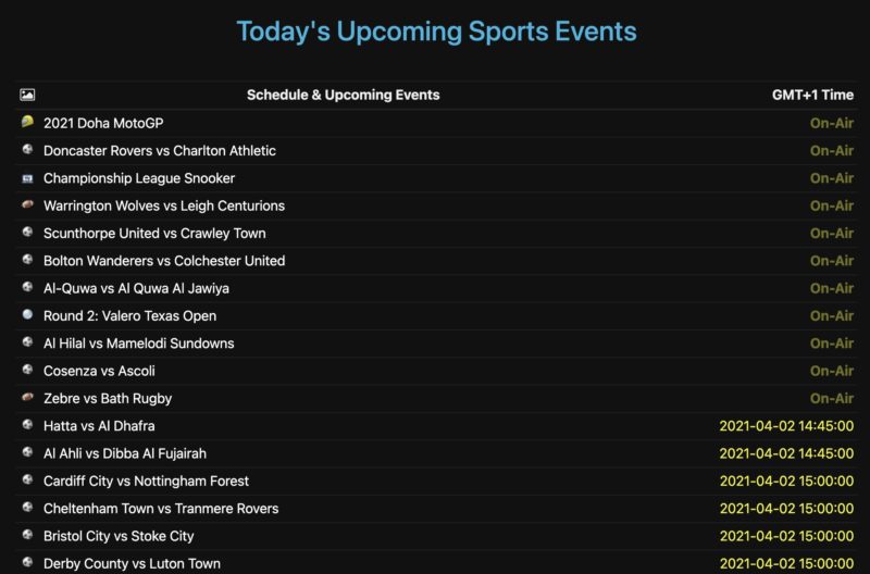 Se nella homepage di Stream2watch clicchi sul pulsante "Today's Upcoming Sports Events" puoi vedere il calendario aggiornato quotidianamente con TUTTI gli sport che puoi guardare gratis in streaming. A fianco di ogni evento trovi anche l'orario, in modo da non arrivare tardi e perdersi l'inizio del match o della gara.