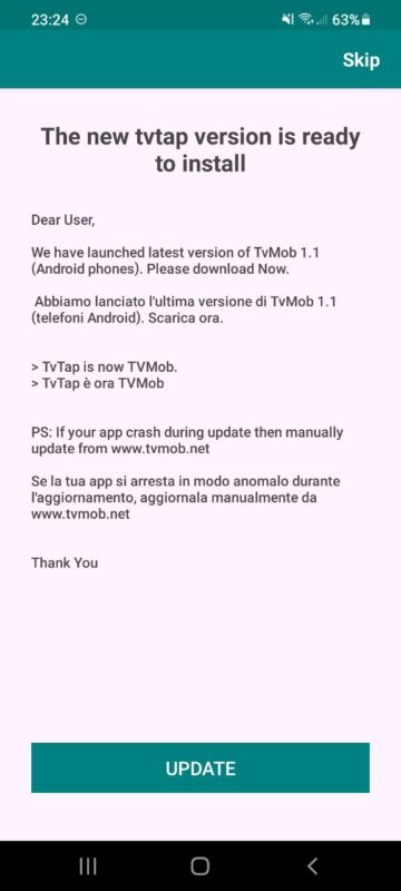 Al momento chi ha installato TvTap sul proprio dispositivo Android può continuare ad usare l'app, ma all'avvio verrà segnalata la disponibilità di un aggiornamento. Chi sceglierà di installarlo, automaticamente andrà ad installare l'ultima versione di TVmob.