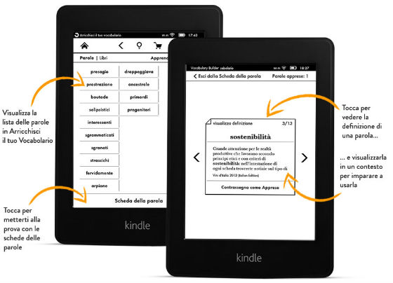 - un vero e proprio vocabolario personale. E’ possibile arricchire vocabolario aggiungendo automaticamente le parole cercate durante la lettura dell’ebook