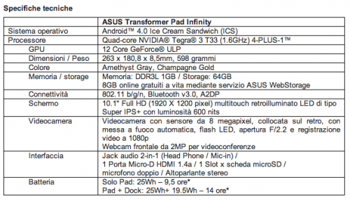 Asus Transformer Pad Infinity arriva anche in Italia a 599 euro, con 64 GB ma senza tastiera