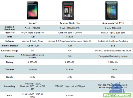 Nexus 7 vs Kindle Fire vs Acer Iconia Tab A110