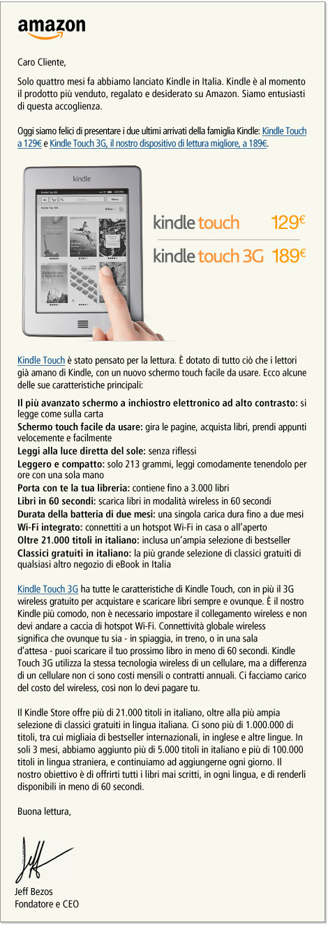 Comunicato Lancio Kindle Touch sul sito di Amazon: