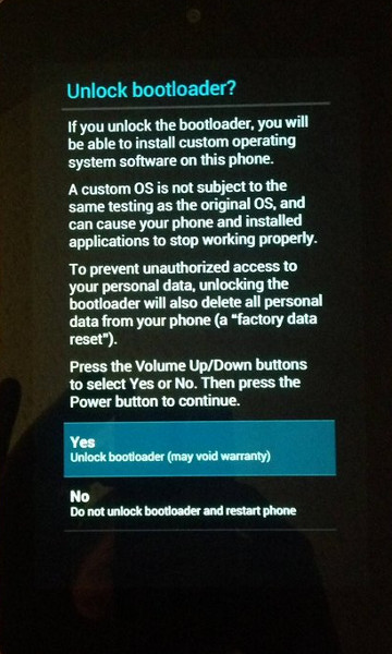 Sbloccando il bootloader i vostri dati saranno cancellati e verranno applicate le impostazioni di default