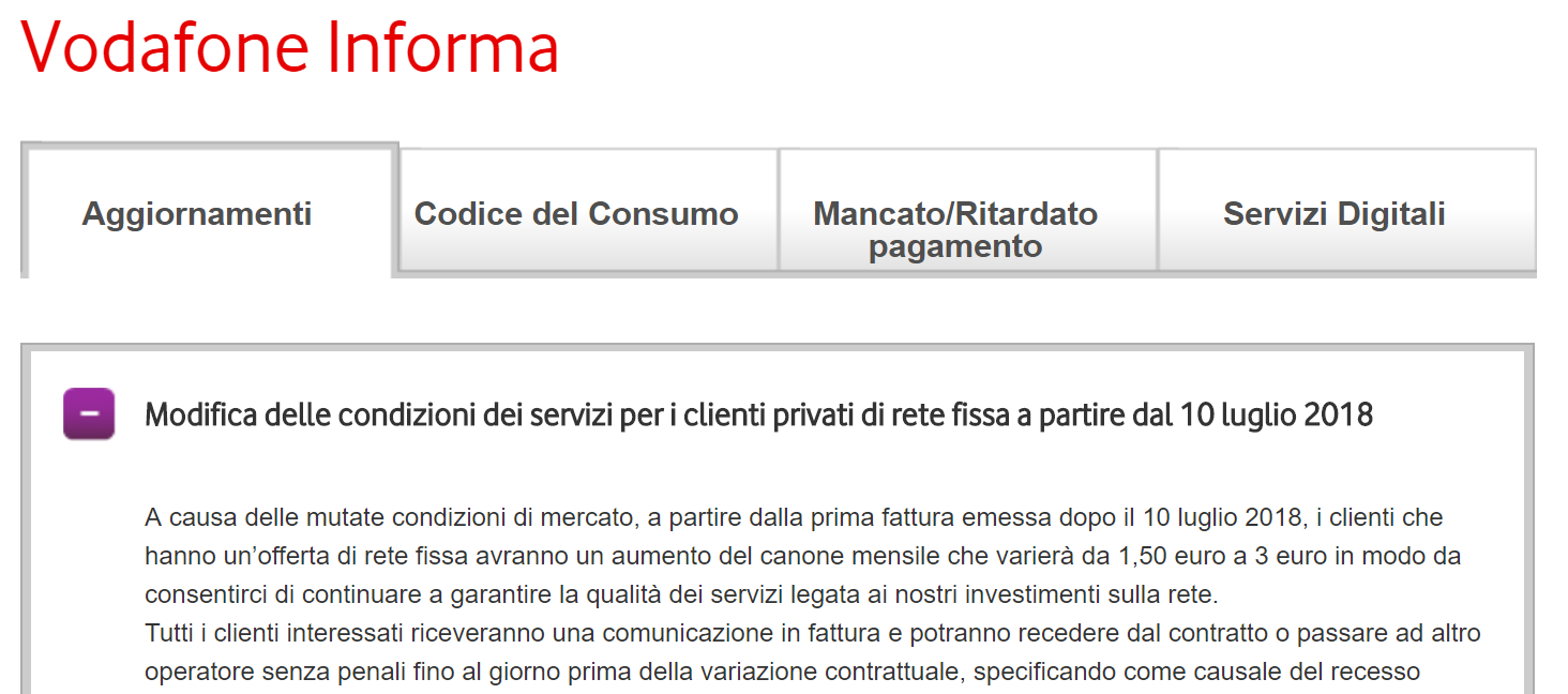 Dopo l'aumento dell'8.6% delle tariffe mobili solo per il passaggio alla tariffazione mensile, prima dell'estate, da Luglio 2018, Vodafone aveva deciso di applicare una serie di aumenti tra 1.5 e 2 euro al mese tra diverse offerte di telefonia fissa e SIM dati.