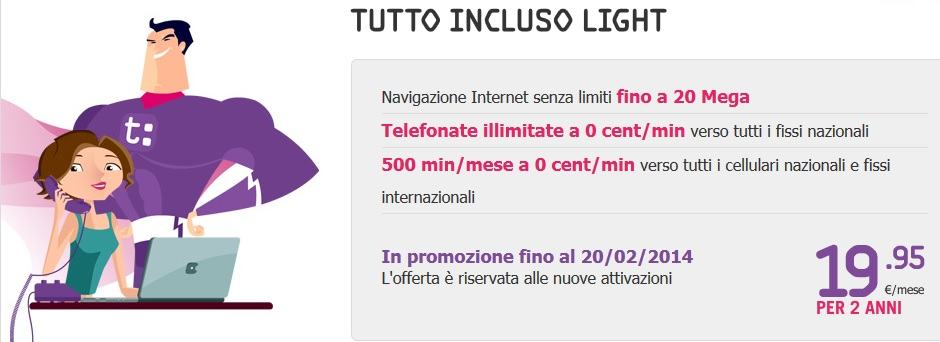 Invece la Tiscali Tutto Incluso Light prevede fino a 20 mega in download e sino a 1 Mega in upload ma con chiamate illimitate verso fissi e mobili nazionali e numeri di rete fissa Internazionali (Europa, USA e Canada sino ad un massimo di 500 minuti al mese) pagando il solo costo dello scatto alla risposta pari a 20 centesimi di euro.