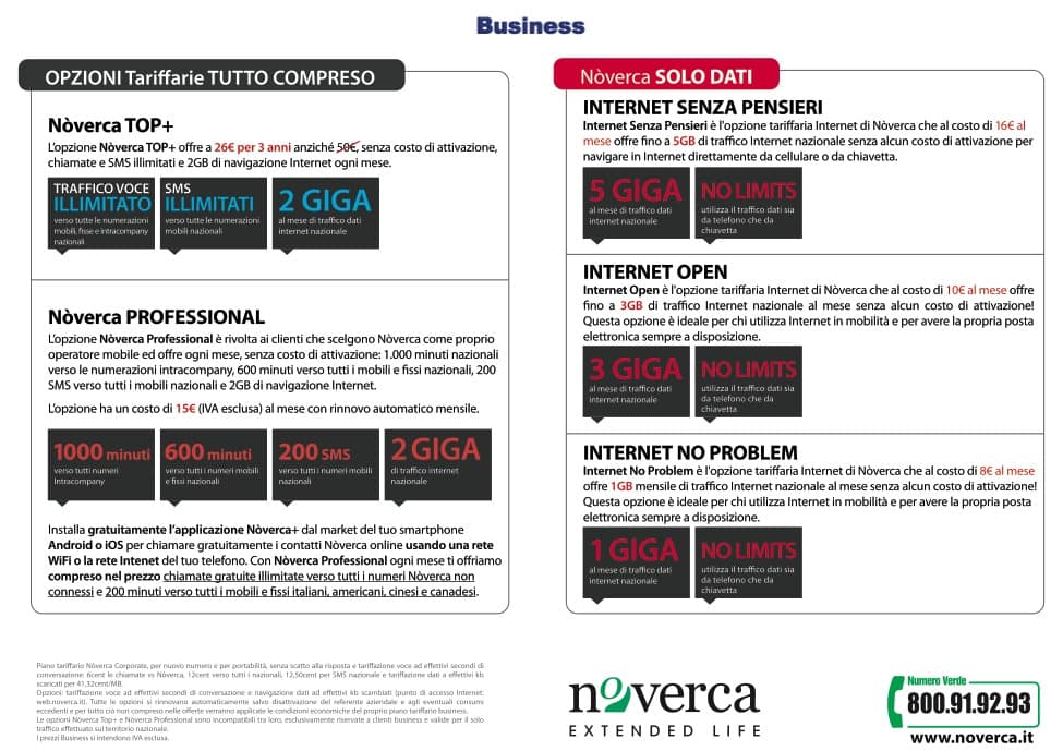 Noverca rivede anche l'offerta Business per chi utilizza il proprio smartphone nell'attività lavorativa con piani tariffari con un minutaggio importante ma anche per chi non vuole pensieri e vuole tutto illimitato, come l'offerta Noverca TOP+ che mette a disposizione Minuti ed SMS illimitati e 2 GB di Internet a soli 26 euro per 3 anni (poi 50 euro).