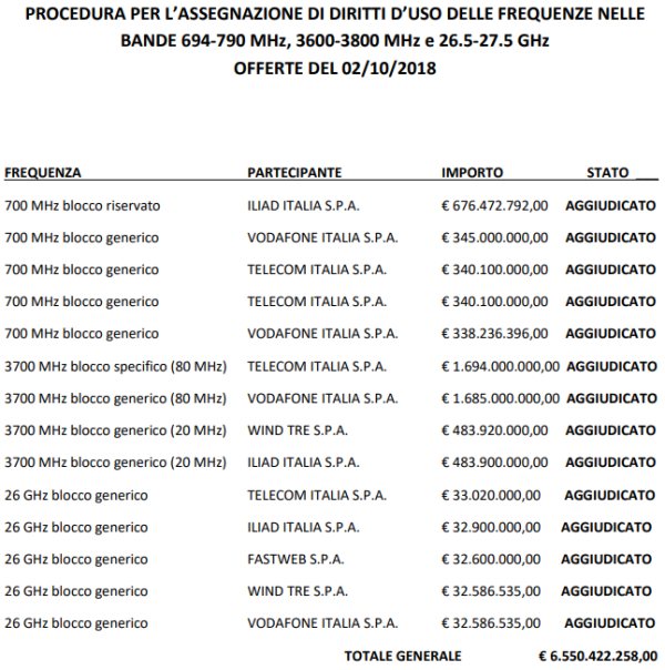LEGGI ANCHE: Asta frequenze 5G terminata: Raccolti 6.5 miliardi. Ecco le assegnazioni definitive